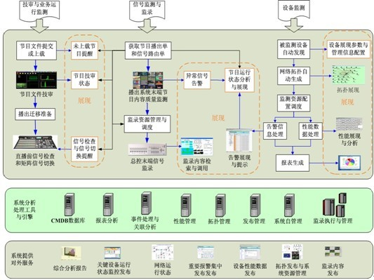 建设播总控系统设备状态与信号监控系统平台既要面向IT与AV设备来建设,同时也要面向电视媒体特有的AV信号进行建设,另外还要包含对业务节点和流程的监测。系统监控的平台级对象包括主机、存储、网络、数据库、中间件、以及AV方面的矩阵、切换台、视音分、加解嵌器、帧同步器、模数转换等不同设备。针对这些平台级监控对象,结合设备的性能指标和故障指标,共同构成播控总控监控系统的设备监测集合。系统同时还对AV信号实时监测和监录。AV信号主要是指的是台内的数字视音频信号HD/SD-SDI及TS流信号。在播出系统的末端,对SDI形式的播出信号进行实时监测,分析节目信号是否出现黑场等质量问题;在总控系统末端对出台的TS流信号进行压缩编码实时监录,用于事后分析查找出台信号是否存在故障。